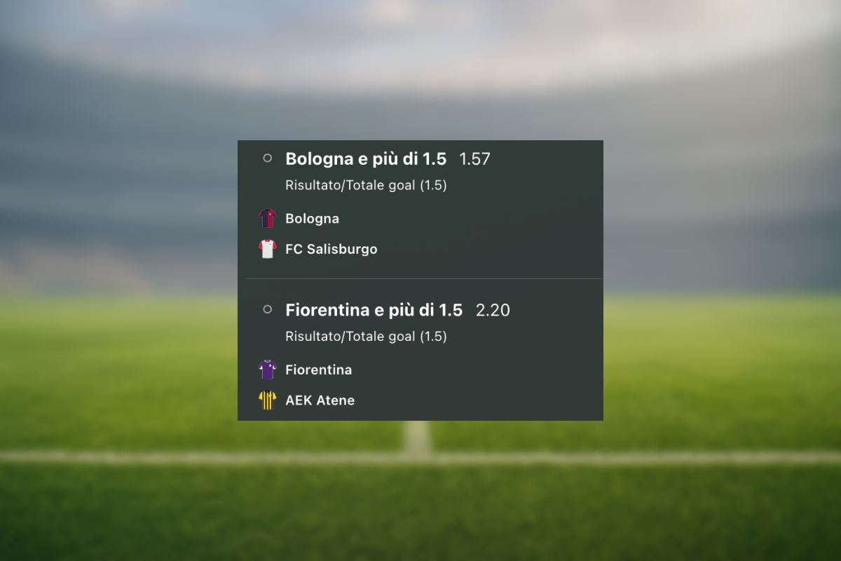 Fiorentina-AEK Atene e Bologna-Salisburgo: la scommessa del giorno di Calcio247 è una doppia 1 + Over 1.5 da quota vicina al 3 e mezzo.