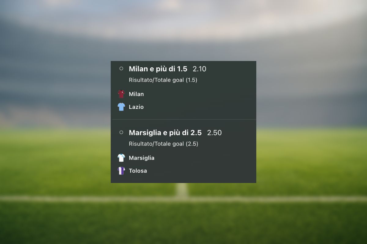 Milan–Lazio e Marsiglia–Tolosa: la doppia del giorno di Calcio247 punta sulle vittorie casalinghe con over moderati. Quota complessiva molto interessante.